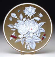 RICHARD CAMEO VASE Brown flowers and leaves on frosted pale yellow ground. Cameo “Richard” signature on side of vase. SIZE: 8-1/2″ t. CONDITION: No pontil as the vase was blown from other direction. Rim possibly reduced. 5-63599 (200-400)