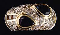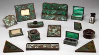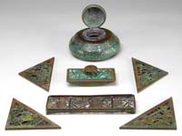 CIGAR LIGHTER Cloisonné-style font sitting on a mixed metal foot with two brass lighters and a ruby shade. SIZE: 10-3/4″ t. CONDITION: Generally good. 5-65467 (400-600)