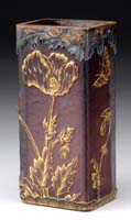 DAUM NANCY CAMEO & WHEEL-CARVED VASE Wheel-carved poppy, buds and leaves with gilded highlights on amethyst textured ground. Wheel-carved butterfly with gilded details on the side of the vase. Original Art Nouveau floral metal rim. Gilded signature on the underside “Daum Nancy”. SIZE: 7-1/2″ t. CONDITION: Very good to excellent. 5-64972 (800-1,200)