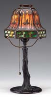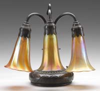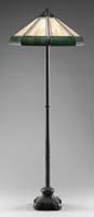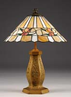 ANTIQUE LEADED FLORAL TABLE LAMP Geometric top shade is decorated with a large apron border of dogwoods in various colors of rouge, pink and cream with foliage in various shades of cream, green and blue. Shade is supported by an original three socket dark patina base. SIZE: Shade is 18″ dia. Overall 23″ t. CONDITION: Overall shade is good but very dirty with possible solder repair. Base is good with three replaced sockets. 5-65002 (1,200-1,500)
