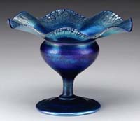 NAILSEA FAIRY LAMP Fairy-size blue nailsea dome shade resting in a clear glass shade cup which rests in a blue nailsea ribbon edge donut base. SIZE: 5-3/4″ t x 6-1/2″ w. CONDITION: Shade and cup are very good to excellent. Donut base is badly damaged. 8-87502 (200-300)