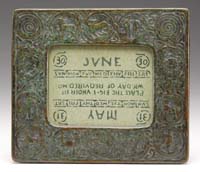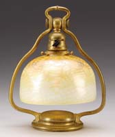 PITTSBURGH REVERSE PAINTED PIANO LAMP Wonderful Pittsburgh lamp has reverse painted shade with full moon over ocean waves. Nighttime scene is painted against an aqua-blue shade with chipped ice finish. Lamp is complete with original Pittsburgh base with impressed floral design on the platform leading to a curved arm with double adjustments. Lamp is signed “Pittsburgh”. SIZE: Shade is 9″ across. Overall 12″ t. CONDITION: Very good to excellent. Support arm has old repair near top shade adjustment bracket. 5-65796 (600-1,000)