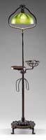 TWO JUNIOR BANQUET LAMPS 1) B & H copper colored shell in a black wrought iron-style base with drop-in font and a yellow cased ball shade. P & A Victor burner. SIZE: 12-1/4″ t. CONDITION: Minor roughness to top and bottom edges of shade, some wear to the gold ring decorating the top edge. 2) Embossed brass font on a wrought iron spiral three footed base with a 6″ green glass ball shade with gold highlighted enamel floral décor. SIZE: Overall 18″ t. CONDITION: Generally good. 5-65519 (300-500)