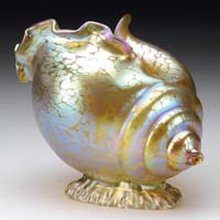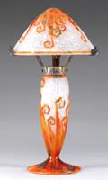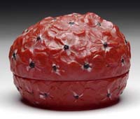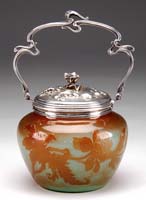 LEGRAS CAMEO POWDER JAR Unusual Legras powder jar has cameo and enameled decoration of aquatic plants surrounding the jar. The lid is decorated with a cameo and enameled seashell. The interior of the jar is cased with translucent amber glass. Signed on the side in cameo “Legras”. SIZE: 4-1/2″ dia. CONDITION: Very good to excellent with very minor roughness to inside lip of jar. 5-65432 (1,000-1,500)