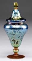 ST. CLAIR PAPERWEIGHT LAMP BASE Three-tiered lamp base with ice pick lily decorations in pastel blue. Attributed to St. Clair. SIZE: 28-1/2″ t to top of finial. CONDITION: Very good to excellent. 5-65004 (200-300)