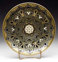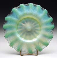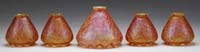 JEFFERSON REVERSE PAINTED SHADE Six sided shade has an Art Deco pyramid design on each panel with alternating panels having an Art Nouveau border. The colors of the shade are orange, chartreuse and blue. A wildly decorated shade. Signed “Jefferson” on the rim. SIZE: 16″ dia. CONDITION: Very good to excellent. 5-65436 (1,000-1,500)