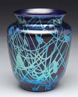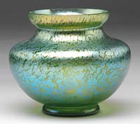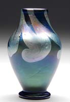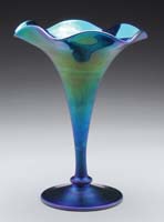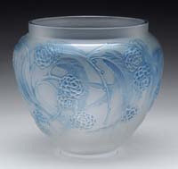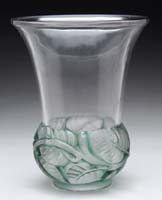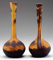 MULLER FRES CAMEO VASE Very nice Muller vase has scenic cameo decoration of pine trees, lake and mountains done in blue cameo against a mottled white background. Signed on the side in cameo “Muller Fres Luneville”. SIZE: 5-1/2″ t. CONDITION: Internal fracture to interior layer of glass, not visible from outside; most likely done in the making. 5-65080 (800-1,200)
