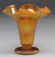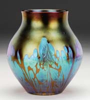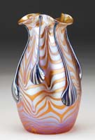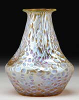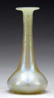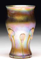EUGENE ROUSSEAU VASE Gilded floral decoration on a clear ground with internal ruby red, copper and light beige mottles. Rectangular mouth with gilded rim. Engraved signature on the underside “E. Rousseau Paris”. SIZE: 10″ t. CONDITION: Some wear to gilding on rim, otherwise very good to excellent. 5-65301 (600-900)