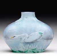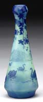 DEVEZ CAMEO VASE Very nice deVez vase has cameo decoration of swans swimming in a lake with mountains in the background and oak branches and leaves above. The blue cameo decoration is done against a background of pale yellow shaded to frosted. Signed on the side in cameo “deVez”. SIZE: 7″ t. CONDITION: Very good to excellent. 5-65159 (500-1,000)