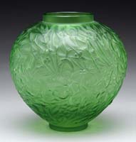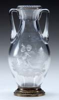 ST. DENIS CAMEO VASE Clear frosted glass with cameo and enamel decoration of purple violets with gold leaves and stems. Signed on the underside in gold “St. Denis”. SIZE: 7-3/4″ t. CONDITION: Very good to excellent. 5-65412 (800-1,000)