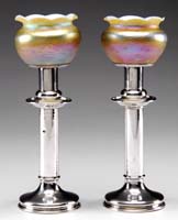PAIR OF PEG LAMPS Pair of peg lamps have pale pink cased glass, ruffled top shades with embossed diamond pattern with matching peg fonts. One font has its burner and is mounted in a silver plated triple dolphin base. SIZE: 5-1/2″ shade fitter. Approx. 15″ t. CONDITION: Generally very good to excellent. 5-65451 (400-700)