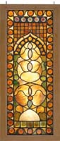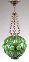 MASSIVE ARTS & CRAFTS GLASS & WOOD HANGING LAMP Geometrically designed wooden Arts & Crafts frame is backed by heavily textured green striated glass. Lamp appears to be all original. SIZE: 28″ across x 16″ deep. CONDITION: Very good to excellent. 5-65389 (500-1,000)