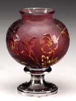 MONT JOYE CAMEO VASE Raisin colored glass with cameo decoration of flower blossoms and green leaves. Gold enamel band at top of vase. Signed on underside “Mont Joye”. SIZE: 7-3/4″ t. CONDITION: Very good to excellent. 5-64996 (400-600)