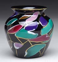 MONT JOYE ENAMEL VASE Clear frosted glass with chipped ice effect and enameled poppy flower blossoms with gold stems and leaves. Ground pontil, square top. SIZE: 8″ t. CONDITION: Very good to excellent. 5-65413 (600-800)
