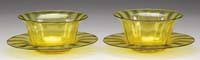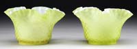 PAIR OF PEG LAMPS Cased shaded yellow, ribbed swirl, satin glass shades with ruffled top edges and matching peg fonts. No hardware present. SIZE: 5-1/2″ shade fitters. CONDITION: Very good to excellent. 5-65448 (500-750)