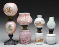 TWO PEG LAMPS 1) Dark shading to light pink cased satin glass, ruffled top, ribbed shade and font with embossed pattern on a silver plated candlestick. SIZE: 5-1/2″ shade fitter. Approx. 17″ t. CONDITION: Generally very good to excellent. There is no hardware present. 2) Dark shading to light pink cased satin glass with ruffled top, ribbed shade and font on a brass candlestick. SIZE: 5-1/2″ fitter. Approx. 18″ t. CONDITION: Generally very good to excellent. There is no hardware present. 5-65449 (500-800)