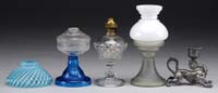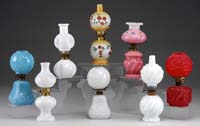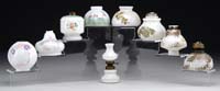 TWO JUNIOR BANQUET-STYLE LAMPS 1) S1-307. Milk glass with embossed design and unfired painted décor. Nutmeg burner. SIZE: 13″ t. CONDITION: Glass is very good to excellent. Painted décor is well worn. 2) White milk glass with blue and brown Delft décor. P & A Victor burner. SIZE: Approx. 20″ t. CONDITION: Glass is very good to excellent. Some wear to the painted décor, burner is missing its shade ring. 5-65460 (300-500)