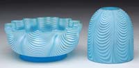 FROSTED GLASS FAIRY LAMP R-248. Bulbous embossed frosted dome with fluted and deeply ruffled blue top rim. Dome rests in a matching low base. SIZE: 6-1/2″ t. CONDITION: Very good to excellent. 5-65486 (200-400)