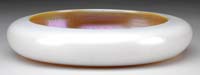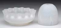 NAILSEA FAIRY LAMP R-656. White nailsea fairy-size dome with matching upright ribbon rim bowl. SIZE: 5″ t x 5-1/2″ w. CONDITION: Very good to excellent. The clear glass shade cup is missing. 5-65497 (400-600)