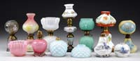 NAILSEA FAIRY LAMP Citron ground nailsea shade and three pointed ruffled underbowl. SIZE: Approx. 6-1/2″ t. CONDITION: Glass is very good to excellent. The clear glass shade cup is missing. 5-65487 (400-600)