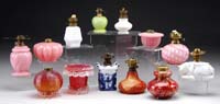 RAINBOW SATIN MINI LAMP S1-Fig. V left. DQ MOP rainbow satin glass with frosted shoulder rigaree and feet. SIZE: 8-1/2″ t. CONDITION: Rainbow coloring on shade is appreciably lighter than the base. There is minor roughness and some oil staining in the fitter edge as well as inside the shade. The base appears to be very good to excellent. The original burner and shade holder has been replaced. 5-65518 (800-1,200)
