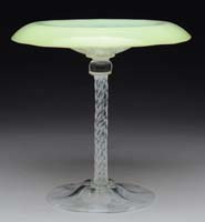 BURMESE FAIRY LAMP Pyramid size acid Burmese dome with matching menu-card base. Base is signed “Thos. Webb & Sons Queen’s Burmese Ware Patented”. SIZE: Approx. 5-1/2″ t. CONDITION: Glass is very good to excellent. The clear glass shade cup is missing. 5-65485 (400-600)