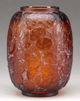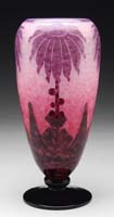 D’ARGENTAL CAMEO VASE Large D’Argental vase has allover cameo decoration of flowers, stems and leaves. Cameo decoration is done in purple and brown against a light blue frosted background. Signed on the foot “D’Argental”. SIZE: 18″ t. CONDITION: Very good to excellent. 5-64997 (800-1,200)
