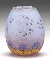 DAUM NANCY CAMEO & ENAMEL MINIATURE VASE Blue bellflowers with green leaves on a shaded and mottled sky blue to deep purple background. Gilded top rim and foot rim. Gilded signature on underside “Daum Nancy”. SIZE: 4″ t. CONDITION: Restored chip to foot, otherwise good. 5-64940 (500-800)