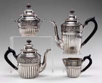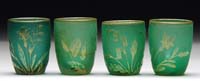 GOUPY ENAMELED JUICE SET Wonderful clear crystal pitcher is enameled with a bird and berry decoration with eight juice glasses having matching berry decoration. Pitcher is signed on underside in enamel “M. Goupy”. SIZE: Pitcher: 9″. Tumbler: 3-3/4″ t. CONDITION: One juice glass has a minor chip to rim, otherwise very good to excellent. 5-63749 (800-1,200)