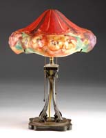 PITTSBURGH OBVERSE PAINTED LAMP Obverse painted forest scene depicts tall trees in full foliage with rocks and grassy terrain. Shade is supported by an original two socket Art Nouveau style base with a lovely aged patina finish. SIZE: Shade is 16″ dia. Overall 23″ t. CONDITION: Good with minor chips to upper rim that are covered when shade is in place. 5-65381 (800-1,200)