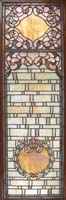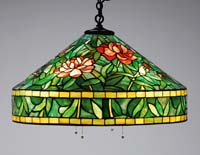 INVERTED LEADED FLORAL HANGER Rare and unusual white geometric and bent panels of glass surrounds a dogwood floral bands in colors of peach and yellow. Hardware consists of three sockets with chains. SIZE: 24″ dia. CONDITION: Overall very good, possibly three pieces of white replaced glass. 5-65390 (1,500-2,000)