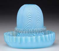 NAILSEA FAIRY LAMP R-656. Blue nailsea fairy-size dome with matching upright ribbon rim bowl. SIZE: 5″ t x 5-1/2″ w. CONDITION: Very good to excellent. The clear glass shade cup is missing. 5-65496 (400-600)