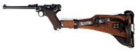 SN 2472. Cal. 9mm. 4-3/4″ bbl. Standard markings. Matching SN. Proper checkered brown plastic grips. This is a first variation gun. These were produced from 1939-1941 with the total production estimated at 2600. These pistols were used by the Finns against Russia in the Winter War. Accompanying this gun is a very rarely seen proper orig wood stock which is stamped “SA” on the attaching iron. The stock doubles as a holster. Spare mag in steel compartment on side. Also with gun is a proper Finnish army marked brown leather holster with another spare mag, tool and brass cleaning rod. Holster is marked “AV3″/”SA” on flap. Marked with an “L” within a circle on closure strap. CONDITION: Extremely fine appears as new, with minor handling marks. Internals are packed with grease. Grips are extremely fine. Bore is full of grease, should be perfect. Mechanics are crisp. Shoulder stock is extremely fine with minor handling marks. Leather holster is extremely fine with strong stitching and very light scuff marks. 52803-2 GER (8,000-10,000) C&R – Lot 3396