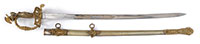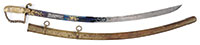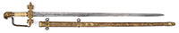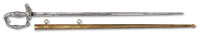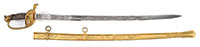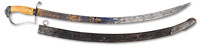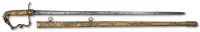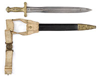 NSN. 1) Cal. .22LR. 24″ bbl. Savage Model 6A “gill gun”. Standard markings. Multi-caliber. Stock is checkered at the wrist. Tube fed under bbl. Accompanying this gun is: 2) French 1866 Chassepot bayonet with scabbard. Markings removed from spine of blade. “16” on crossguard. Does not appear to have had any other number or proof marks. Brass handle. Scabbard is of the standard style with French numbering on back. 3) Silver painted unknown socket bayonet. 4) Springfield 1903 bayonet with wood handles dated 1911. SN blade. WWII style long composite scabbard. 5) Large 1812 period socket bayonet. Markings on blade are illegible. Hole rusted through on top of socket. Blade is 1-13/32″ at the widest point. 6) Brass unmarked powder flask with birds on either side; missing catch spring and top pins. 7) Leather shot pouch with embossed dog on either side. Marked “3 lbs” on one side. Maker’s mark appears to be “AM.FLASK&CAP CO” on spout. Shot inside. PROVENANCE: Daryl Middlebrook collection. CONDITION: 1) Gun is in fair condition with some light to moderate surface rust in various places. Markings are clear. Wood is good with light scratches and handling marks. Checkering is sharp. Bore is fine with sharp rifling. Mechanics are functional. 2) Pleasing patina overall with light surface rust. Blade appears to have been lightly sharpened. Push button catch needs cleaning and lubrication. 3) Relic condition with rear of socket having been spread. Ring at back of socket broken with piece missing. Socket out of round; blade slightly bent. 4) Blade shows evidence of being sharpened some time ago. Markings are clear. Wood grips show wear with crack on left grip. Latching mechanism in good working order. Scabbard shows wear with ding, handling marks and scratches. Throat has light pitting with clear marking. 5) Relic condition with hole from rust as noted. Light to moderate pitting overall. 6) Pleasing patina with light dings. 7) Leather shows crazing with scuff marks. Stitching is solid. Spout mechanism in good working order. 53098-10 GER (100-200) C&R – Lot 3449