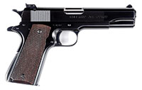 SN 116231. Cal. 45 ACP. 5″ bbl. Slide right has Springfield Eagle above SN with “Model of 1911.U.S.ARMY”. Left side marking shows standard Colt 1911 patent marking with “SPRINGFIELD ARMORY” / “U.S.A”. Rear of slide shows flaming bomb. Front sight is Springfield integral machined sight. Rear sight is square cornered Springfield made sight. Hammer has typical Springfield Armory contour, firing pin stop plate has typical Springfield rounded upper edge. Slide stop is properly checkered all the way to the top. Bbl bushing has proper thin, beveled front edge. Stocks show typical Springfield Armory checkering. Grip safety shows proper sharp bottom edge. Main spring housing shows proper square bottom corner. Magazine catch body shows proper finish. Magazine is standard Springfield folded bottom type with copper plating shown on upper rear portion and heat treating marks on the upper portion. Bbl is Colt made with vertical “P H” mark showing through ejection port. CONDITION: Overall condition is very fine with approximately 95% orig finish. Lower stock screw left appears to have been modified and shows cold blue. Stock screws right appear to have cold blue. All screw slots appear crisp. All parts appear to have approximately 95% of their orig finish with most loss on front grip strap. Right stock shows five hash marks on upper diamond. Magazine is in excellent condition with only some slight wear to copper area at top but has small crack in upper right corner. Bore is very good with only minor pitting. Mechanics are crisp. 52792-3 KXK (2,500-6,000) C&R – Lot 3418