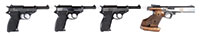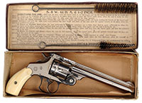 1) HERTERS DERRINGER. SN 105046. Cal. .357. 3″ bbls. chrome plated finish. Made in Germany. Plastic grips. Styled directly after the Remington O/U Derringers. PROVENANCE: Daryl Middlebrook collection. CONDITION: Fine with light handling marks. Markings clear. Grips have minor handling marks. Bores are fine with good rifling. Mechanics are fine. IMPORT 2) HAWES DERRINGER. SN 29185. Cal. .22LR. 3″ bbls. Marked “WESTERN DERRINGER” on left side of bbl rib. Made in Germany. 67 dated on left side of bbls. White plastic grips. Chrome finished hammer, trigger, and opening lever. PROVENANCE: Daryl Middlebrook collection. CONDITION: Very good with most of the proper finish. All markings clear. Grips have minor age cracks. Bores are very good with strong rifling. Mechanics need attention. C&R; ESA 3) HARRINGTON & RICHARDSON YOUNG AMERICA. SN 4164. Cal. .32. 2″ bbl. Marked on top of frame “YOUNG AMERICA / SAFETY HAMMER”. Patent date on left side of hammer of 1887. Hammer made without spur. H&R bbl address on top left flat. Hard rubber grips with SN of gun scratched inside. Nickel finish. Double action only. PROVENANCE: Daryl Middlebrook collection. CONDITION: Good, with a fair amount of finish, some flaking and bubbling in areas. Orig blue on trigger guard. Traces of case colors on either side of trigger. Markings are clear. Bore is dirty with strong rifling. Mechanics are functional, trigger return spring is weak. ; C&R4) SMITH & WESSON 61-3. SN B51111. Cal. .22LR. 2-1/8″ bbl. Standard markings. Proper brown plastic grips. Two factory mags. PROVENANCE: Daryl Middlebrook collection. CONDITION: Very good, with a fair amount of orig finish, wear on high points. Markings are clear. Grips are fine with light scratches and handling marks. Bore is fine with strong rifling. Mechanics are functional. Special Note: This item(s) contains plant or animal properties that may be covered by the Endangered Species Act (ESA). Please read the Conditions of Sale, section 15, for more information regarding the Endangered Species Act, and your responsibilities as a buyer. 53098-4, 53098-5, 53098-6, 53098-7 GER (250-400) – Lot 3448