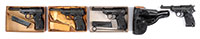 1) KAHR PM9. SN 437-000213. Cal. 9mm. 3″ bbl. Matte finish stainless slide. Equipped with frame/trigger guard Crimson Trace laser sight. Two mags. Factory matching box. PROVENANCE: Daryl Middlebrook collection. CONDITION: Very fine, showing minimal handling marks and use. Plastic grip is excellent. Excellent bore. Mechanics are crisp. Laser sight in good working order. Interior of box has been modified to fit gun with laser sight mounted. 2) TAURUS JUDGE. SN BP606350. Cal. .45LC/410GA. 3-1/8″ bbl. Stainless steel. Made in Brazil. Equipped with Crimson Trace grip mounted laser sight. Orig grips are no longer present. Factory matching box. PROVENANCE: Daryl Middlebrook collection. CONDITION: Very fine with minimal handling marks. Grips are excellent. Laser sight in good working order. Excellent bore. Mechanics are crisp. Box is excellent. IMPORT 53098-8, 53098-9 GER (650-1,000) – Lot 3447