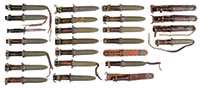 The M3 trench knife was developed in 1943 and was manufactured by at least 9 companies. Procurement records at Rock Island Arsenal document that the government purchased over 2-1/2 million of these knives during 1943 and 1944. Even with such high production figures, it is a scarce knife to find in high condition as these knives saw continued use for utilitarian purposes. The M4 bayonet is basically the same design as M3 but had an additional bayonet ring and lock for use on M1 carbines. This collection contains examples of most every known manufacturer and variations with blade markings and guard markings. Makers represented include Camillus, Utica, Henry Boker, PAL, Imperial, Case, Aerial Cutlery Company, Kinfolks, and Kiffe, Japan on an M4. PROVENANCE: The collection of Robert Roughton. CONDITION: Most knives are very good to fine condition overall with either leather or composite scabbards. The only knife missing scabbard is in poor condition, Utica M3 with “U.C.1943” blade mark, blade is highly sharpened and re-shaped with pitting. 53079-11 JS (2,000-3,000) – Lot 3423