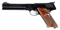 SN 309550S. Cal. 22 LR. 6″ bbl, full blue finish, 2-pc American walnut grips with checkering and thumb rest, adjustable target sights. Left side of bbl shows 1-line Colt address. Left bbl lug shows Rampant Colt logo over “MATCH TARGET”. Left slide shows “COLT AUTOMATIC CAL. 22 LONG RIFLE”. Right side of bbl lug is struck with SN. Front sight is mounted on ramp; Elliason rear sight is adjustable for windage and elevation. Pistol is housed in a wood grain cardboard Colt box. SN on rear of box has been crossed out and is different from this pistol. End label shows 6″ bbl, blue finish. Box contains instruction flyer for this model. CONDITION: Very fine. Pistol shows 99% of orig Colt finish overall. Bore is bright with strong rifling. All markings are sharp and clear. Grips are fine with sharp checkering and no evidence of handling marks. Mechanics are crisp. Box is very good. Lid has two broken corners and some scuff marks. Bottom is also scuffed. End label has some losses. A chance to obtain a fine quality Colt Woodsman Match Target pistol. 53080-66 TEP (1,000-1,500) C&R – Lot 3433