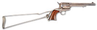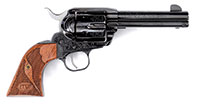SN JW-00354. Cal. .45LC. 4-5/8″ bbl. Standard markings. High polish finish. Factory engraved with John Wayne’s signature in gold on top of bbl. Fancy wood checkered grips featuring “JW” in circle on either side. Total production consisted of 3500 revolvers. Accompanied by factory matching box with outer sleeve. CONDITION: Very fine with slight drag line around cyl. All markings crisp and clear as is engraving. Wood grips are excellent. Bore is excellent. Mechanics are crisp. Box is excellent. Outer sleeve has minor staining, scuff marks, and slight tears. 53080-69 GER (500-750) – Lot 3442