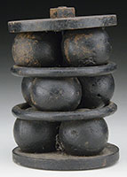 11-3/4″ overall, 6-3/4″ narrow blade, 7/8″ wide at ricasso, 2-1/4″ clip-point. Blade stamped with Scagel’s trademark kris. Grip is made from stacked leather, red composition, copper and aluminum spacers with a crown stag pommel, teardrop shaped 1-1/2″ crossguard. Accompanying leather scabbard has script “R” embossed on rivets. CONDITION: Good overall, no orig finish. Blade cleaned to a grey/bright metal. Old sharpening with a Damascene like texture with several occlusions as can be seen in photos. Accompanying brown leather scabbard fits knife well with comparable use. 53082-2 JS (6,000-8,000) – Lot 3422