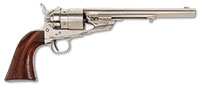 SN 4796. Cal. 44. 7-1/2″ bbl. This pristine example of the Richards Mason conversion has the 2-line patent dates on the frame .44 caliber marking on the trigger guard and is a 6 notch cylinder as opposed to the scarcer 12 notch cylinder. All SN’s matching. The loading gate undoubtedly matched to the number on the frame, but did not disassemble to verify this. Revolver is remarkable in that it retains nearly 100% of its orig bright nickel finish. Most of these saw heavy use on the frontier and were often cut down and later sent down to Mexico. Considering the rarity of a pristine Richards they should be worth more than comparable single actions not less. PROVENANCE: The esteemed collection of Rafael Cruz. CONDITION: 4796 is in near pristine condition throughout. The bbl retains nearly 100% bright nickel as does ejector rod housing. Cylinder has perfect Naval engagement scene. Frame is pristine with one small peel on right side. Backstrap & trigger guard retain nearly 100% orig Colt factory nickel finish. Screws are very good. Grips with some minor dents on left side retain nearly all their orig bright factory varnish. Bore is excellent and front of cylinder indicates gun has been fired very little if at all. Action is tight as new. A very fine example of this scarce revolver. 53073-15 (12,500-22,500) – Lot 1404
