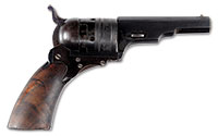 SN 14312. Cal. .36. 6-1/2″ rnd bbl. Single line New York address with cased color frame, hammer and loading lever, fluted 5-shot cyl with silver washed brass trigger guard and backstrap and 1pc varnished walnut grips. Mfg 1862. A large portion of the production of these revolvers were later converted to cartridge, so fine condition original examples are not overly common. PROVENANCE: Fritz Baehr lifetime collection. CONDITION: Very fine with most Colt factory blue finish remaining on bbl assembly with an estimated over 60% blue finish remaining on cyl. Vivid case colors remain on frame and protected areas of hammer and loading lever. Little silver wash finish remains with the exception of protected areas around trigger and trigger guard. This is a very fine, all numbers matching example still retaining all 5 safety pins on rear of cyl. Most screws are fine, however show evidence of removal with an ill-fitting screw driver at some earlier period. Bore is excellent with slight corrosion at muzzle. Mechanics are crisp, however safety position on hammer fails to engage. Otherwise, an exceptional example. 53096-8 TDW (2,500-4,500) – Lot 1403