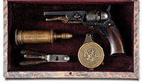 SN 60777. Cal. 36. 7-1/2″ bbl. Henry L. Abbott (1831-1927) was a lifelong military man from Beverly, Massachusetts. Abbott graduated 2nd in his class from West Point in 1854. His four years at the military academy found him always at head of the class or number two. Upon graduation he chose the Artillery Service, but the brightest students typically ended up in the more prestigious Engineering Corps. The Academy Adjutant convinced Abbott to join the Engineers and he would indeed see American frontiers as he wished. Abbott was quickly assigned to survey the area on the Pacific Coast for the Trans-Continental Railroad. Abbot kept a detailed diary and notes of his travels in the Pacific Northwest which were published in the Oregon Historical Quarter in 1932. A copy of this 48-pg text accompanies this lot. During the Civil War, Abbott was wounded at the 1st Battle of Bull Run, later becoming topographical engineer and was in charge of artillery during the Peninsula Campaign in 1862. January 19, 1863, he was appointed Colonel of the 1st Connecticut Heavy Artillery, transferring March 3, 1863 as Brigade Commander. In May of 1864, he commanded the artillery during the siege at Petersburg and his classic military text, Siege Artillery in the Campaigns Against Richmond With Notes on the 15-Inch Gun which was printed just after the war. Abbott commanded siege artillery during the successful bombardment of Ft. Fisher in January 1865. In post-war years, Abbott continued to serve in the US Army Corps of Engineers. Abbott’s influence would be seen in coastal defenses well into the 20th century. Abbott is the father of the submarine mine system, still used today. After Abbott’s retirement from military service, he designed a lock canal system that convinced President Theodore Roosevelt to adopt the Panama Canal construction as we know it today over a majority consensus that recommended a sea level canal. Indeed, Abbott’s engineering legacy lives on today. This lot includes an 1868 detailed letter to Edward Dana concerning his concussion fuse along with a hand drawn sketch of “The Dana Concussion Fuse” and handwritten explanation of its mechanism. There are two other letters concerning artillery and mortar fire, along with a an 1868 review of Abbott’s siege artillery book published in 1868 which a later addition accompanies. Two other wrap bound books also accompany, both by Abbott; Early Days of the Engineer School of Application, 1904 and Half Century of a West Point Class 1850 to 1854 with annotations by Abbott concerning classmates. Also included, are three wartime photographs of Abbott: two CDVS; one as Captain, circa 1862, one is Colonel, circa 1863 and an 1865 cabinet card as Brevet Major General. Other wartime documents include: his Captain’s appointment and a pass to leave Washington defenses to Alexandria. Also, Brigadier General transmittal document from 1904 and a scarce silver 1st Connecticut Heavy Artillery membership medal with ribbon. Abbott’s pistol is in remarkable condition, retaining most of its orig finish and is most unusual in that it is a US Martial with inspection cartouches on stocks and sub-inspector marks on most every metal piece. Very usual is the fact that the brass trigger guard and backstrap are silver-plated, retaining virtually all their well patinaed surface. Gun is housed in a compartmented mahogany Colt case with paper label glued to surface “MY OLD COLT REVOLVER / CARRIED BY ME THROUGH THE / CIVIL WAR 1861-65 / H.L.A”. Casing is green velvet lined, retaining Colt Patent 2-cavity mold with wooden handle extension tied with chord, L-shaped gun tool, tin of caps and a small oil bottle. CONDITION: Very fine overall, all matching. Bbl and cyl retain about 80% orig blue with areas of staining and pinprick pitting. Bbl housing on right side has numerous small dings and dents at wedge and wedge slot. Hammer and loading assembly have strong traces of bright case colors. Frame has traces of case colors with an overall plum/grey patina. Backstrap and trigger guard retain about 90% orig silver-plate with freckling. Screws show about half their orig blue. Rolled Ormsby cyl scene is 95% intact with all 6 safety pins intact. Grips are very fine, still showing raised grain with bright cartouches with light edge wear. Mechanics need attention due to grease build up. Cyl chambers show strong blue finish with bright shiny crisp bore. Paper and ephemera are all very good. 53179-1 JS (12,000-15,000) – Lot 1400