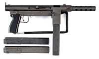 SN P0093. Cal. 9mm. 8-1/2″ bbl. This MK Arms model 760 machine gun is a copy of the Smith & Wesson Model 76. This specimen in addition to its swing out shoulder stock also includes a spare metal hand grip with attachment screw so that it can be reconfigured as pistol grip only gun. Five 36 rnd double stack mags are included, on 1 of which the “rnds remaining” indicators are in Farsi. This gun has been retrofitted with a sight base for attaching an unknown type of sight which is not present. It is a select fire machine gun with ambidextrous selector. The orig owners manual and parts diagram is included. This is a National Firearms Act item and requires BATF approval prior to transfer. This weapon is fully transferable on an ATF form 3 or form 4. CONDITION: Overall appearance and finish is extremely fine smooth gray Parkerized finish with some slight wear at the point where the bolt rides within the receiver and where the selector switch rotates. Rubber protective coating on swing out shoulder loop also very fine. Mechanics are fine. Bore is extremely fine, shiny and bright. Composite handgrip also very fine. A great little recreational sub-machine gun. 53171-9 JWK (4,500-6,500) – Lot 1051