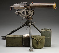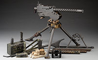 SN 151470. Cal. .30.06. 24″ bbl. Attractive example of the Browning 1917 machine gun as manufactured by N.E. Westinghouse Co., and subsequently registered by Douglas Oefinger. Includes WW II era water chest, steam condensing hose in case, wooden ammunition box w/ 100-rd cloth belt w/ approx. 42 rds of commercial Winchester ammunition, 2 additional grommet ended cloth belts and post WWII gunner’s kit box w/ spare bolt, spare parts roll, lubricating can, tool roll and spare main spring, as well as WWII era 1917A1 tripod. External SN is the only visible SN The 1917 Browning was fielded during WWI and later modified to 1917A1 by adding a reinforcement stirrup at the bottom of the receiver plates. Unmodified specimens in their orig configurations are extremely rare. This is a National Firearms Act item and requires BATF approval prior to transfer. This weapon is fully transferable on an ATF form 3 or form 4. CONDITION: Very fine orig finish thinning to a pleasing gray-brown patina w/ some high edge wear at tripod attachment points, with pleasing dark patina to bronze trunnion and end cap. Thumb piece on water fill cap intact, chain and drain plug at muzzle are replacements, with remnants of the cork plug in steam output aperture. Mechanics are crisp, very smooth action, bore is very good w/ some shine, dark in the grooves w/ moderate pitting. Ammo box and water can exhibit fine orig paint and appear very serviceable. Steam hose and cover extremely fine, appear unissued, as does gunner’s box and tools. Tripod retains legible 1942 date on brass data plate w/ very fine paint coverage. This is a wonderful opportunity for the WWI American machine gun collector who desires a fully transferable specimen of a very rare WWI collectible for their personal collection. 53161-1 JWK (17,500-25,500) – Lot 1062