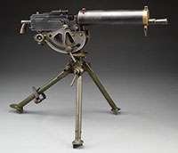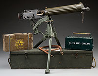 SN H4879. Cal. 303. 28-3/8″ bbl. Extremely fine British proofed early fluted jacket Vickers water cooled machine gun as registered by Dick Wray. Current registration form indicates “VSM” with “Cincinnati, OH” address with model “Vickers”. Accessories include three feed blocks, three locks, one bulb type flash hider, one Fuzee spring, three drain corks, three tabless cloth belts, three WWII brass tabbed Dunlop cloth belts, one steam hose, one water can, one metal ammo can, four wooden boxes of belted .303 ammunition on tabless cloth belts, two metal ammo boxes with two wooden boxes of belted ammo marked for the country of Jordan and 10 spare Vickers bbls, all in .303 British. Also an orig Vickers Armstrong tripod with brass identification plate with later model tripod head and metal ammo box frame. This very handsome fluted jacket Vickers gun has an “FBP” marked muzzle attachment with brass chain and brass .303 feed block currently installed. Right side plate marked with SN below feed block opening and this number matches number on top of water jacket. Attractive walnut back plate handles retain oil caps, cross head and numerous parts including back plate, top cover trigger bar, top cover and water jacket, all are “VSM” marked. Bbls range from “VSM” marked to “VAC” marked and “MA” marked, so there is a full range of the different eras of bbl manufacturing. Several of the ammo boxes are sealed, one opened box contains orig British corrosive .303 ammunition on tabless belt. Approximately 2,000 rnds total. Spare feed blocks also brass. Two locks are Australian manufacture, third is marked “VSM”. Orig water jacket patch WWII repair kit in tin box.This is a National Firearms Act item and requires BATF approval prior to transfer. This item is fully transferable on an ATF form 3 or form 4. CONDITION: Overall appearance and finish are very fine with over 90% orig finish on water jacket with the balance an apparent refinish with subsequent wear to the high edges particularly on the back plate with some scattered brown spots on the Fusee cover and some areas turning a gray patina. Water jacket filler and drain plugs in very good condition. Cork in steam outlet fractured but in place. Bbls range in condition to very fine deep lustrous finish on the “MA” marked bbl to scattered brown light pitting with most of the bbls having fine bright bores and anti-moisture storage paper in the bores. All locks appear to be in serviceable condition with the two Australian locks being near mint. Belts likewise all appear to be in fine serviceable condition as is steam hose. Mechanics are functional. Uncleaned bore in gun with other bores ranging from good to very fine. The Vickers machine gun enjoys great popularity because it can be readily converted to multiple calibers such as .30-06, .308, 8mm, and most usually 7.62 Russian. This versatility together with its classic durable design and attractive looks make it an institution at shooting ranges for the foreseeable future. 52939-34 JWK (12,000-18,000) – Lot 1052