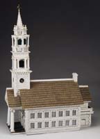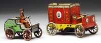 MINIATURE HORSE-DRAWN HEARSE. Early creation in pine with glass insert windows, spring shocks, opening back doors and front axles and wheels pivot on a brass pivot ring. Interior is lined in red felt and other fabric and both viewing windows have velvet curtains with silver fabric tassels. SIZE: 26-1/2″ l x 6-1/2″ w. CONDITION: Generally good to very good, replaced spokes on three wheels. 1-8330 AT (800-1,200)