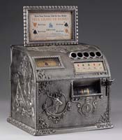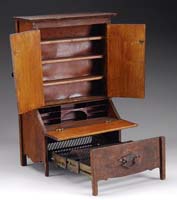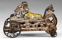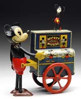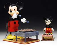 HEUBACH MECHANICAL BOY DOLL IN BED. Rare musical/mechanical crank toy of boy in bed with marked Gebruder Heubach head. When crank behind bed is wound music plays and the boy abruptly sits up from his pillow. SIZE: Bed: 9-1/2″ l (24cm) x 6-1/2″ (17cm). CONDITION: All original excellent condition, a rarely found object. 1-8285 RS (500-700)