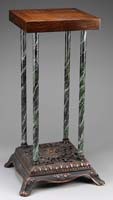 FIGURAL CAST IRON CIGAR ADVERTISING CLOCK. Fabulous counter top advertising clock for the L.O. Grothe & Co of Montreal promoting “The Boston Cigar” and “The Peg-Top Cigar”. Clock features its original Ansonia Clock Co. insert flanked by a figural pair of formally attired gents amidst a cascade of tobacco leaves. SIZE: 15-1/2″ w x 11″ h x 2-1/2″ d. CONDITION: Very good with uniform surface wear. Surface retains some of its original copper flashing and a later but old mustard yellow paint. Clock appears to need adjustment. 1-8261 PF (800-1,200)